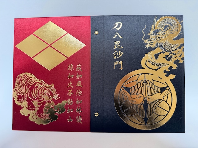 武田・上杉 御朱印帳(蛇腹式)は、戦国時代の勇将たち、武田信玄と上杉謙信の歴史を感じることができる特別なアイテムです。この印帳を使って、貴重な旅の思い出をしっかりと保管してみてはいかがでしょうか! 表紙には武田家の家紋と上杉家の家紋が美しくあしらわれており、表紙を金紙で上品な雰囲気を演出します。裏面にも歴史的なシンボルが施されており、所有する喜びを一層感じられるデザインです。日常でも自信を持ってお使いいただける逸品です。 片側には15枚分のポケットが配置(御城印用)されており、もう片側には15面の奉書紙(ご当地のハンコ用)の仕様です。 追加ポケットを購入されると最大30枚御城印が入ります。 *追加の御城印帳用ポケット15枚セットとゴムバンドは別途販売中です。 歴史の舞台に思いを馳せる瞬間、ぜひこの印帳とともに旅をしてみませんか?素敵な思い出があなたの心に刻まれることでしょう。 表紙サイズ 縦190mm 横130mm ポケットサイズ 縦約175mm 横(最大)約120mm (ポケットは横入れです) 写真の御城印は販売していません