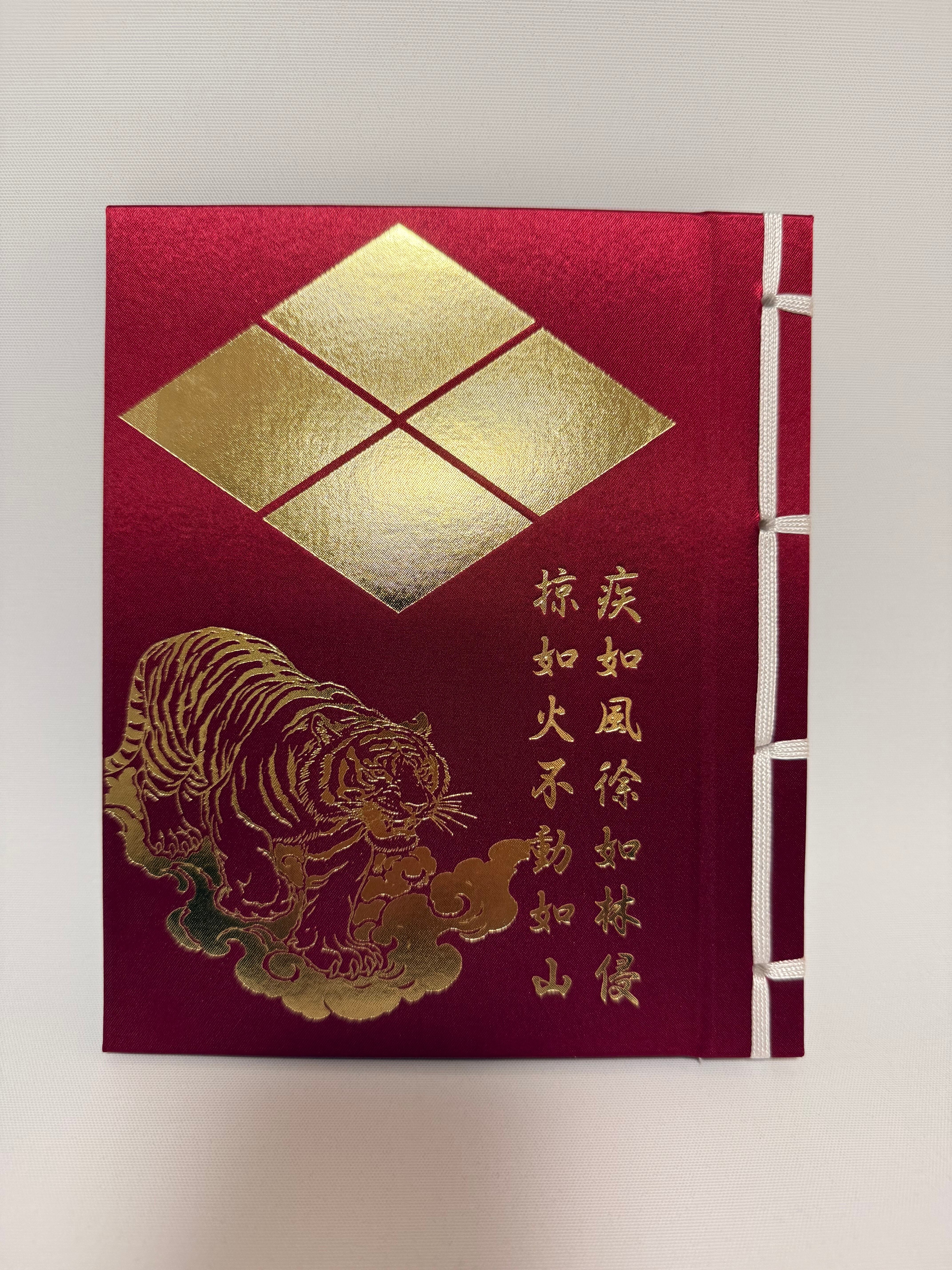 表紙には上杉謙信と武田信玄の家紋と龍虎が美しくデザインされ、厳かな雰囲気を醸し出す仕上がりが魅力的です。裏面にも二人の戦国の歴史を感じさせるシンボルが施され、所有する喜びを一層引き立てる逸品となっています。日常生活でも自信を持ってお使いいただけること間違いありません。