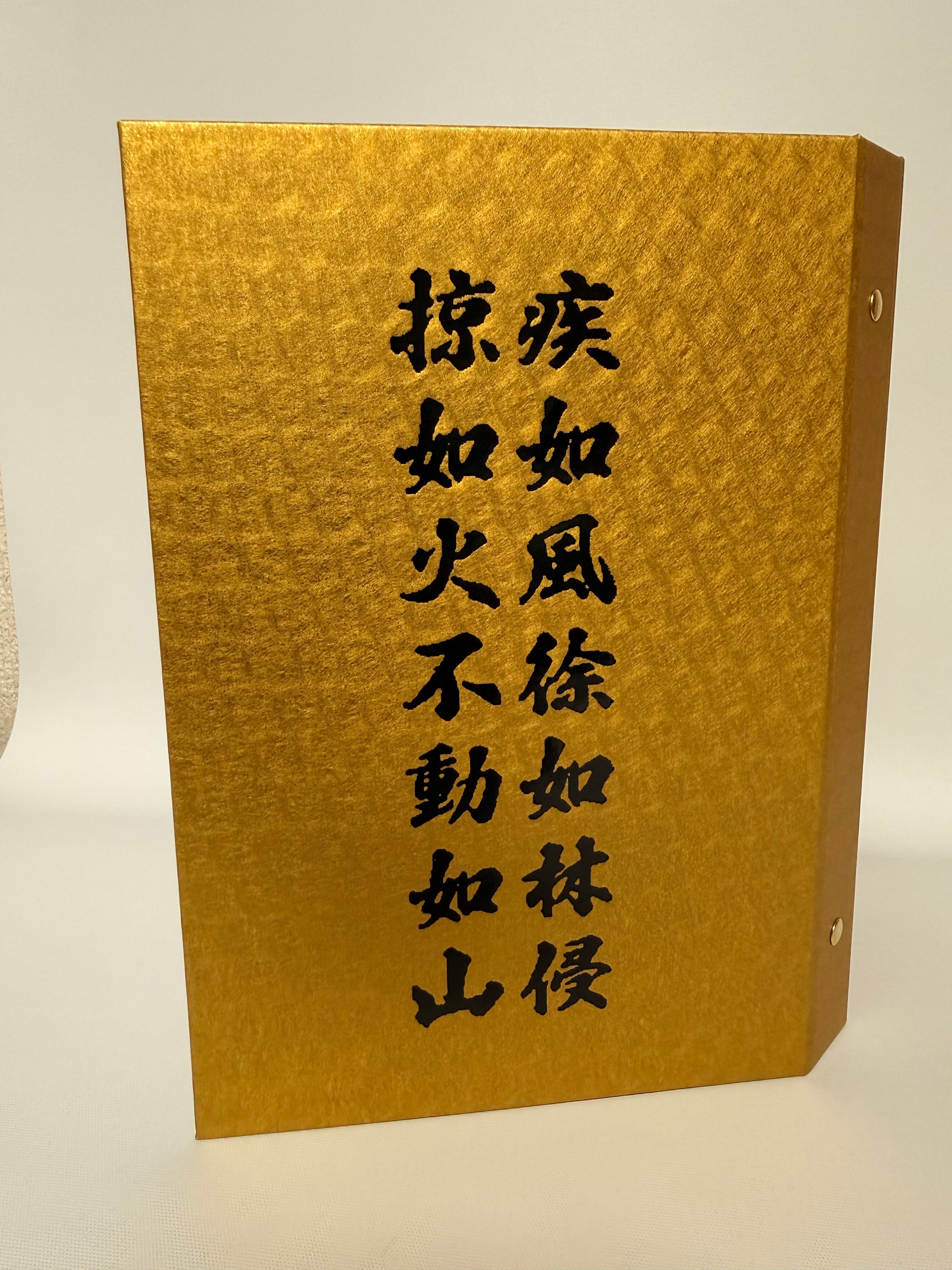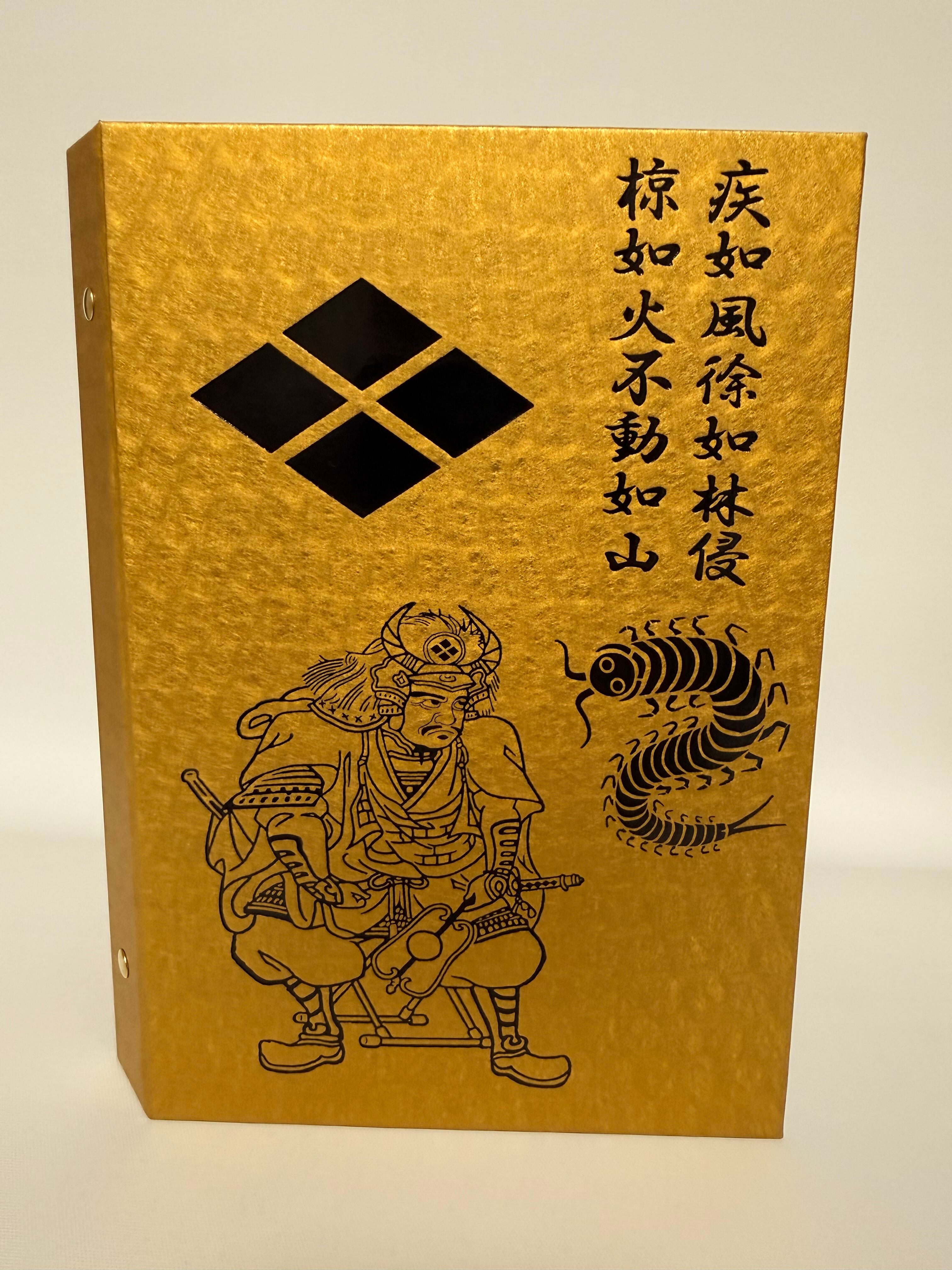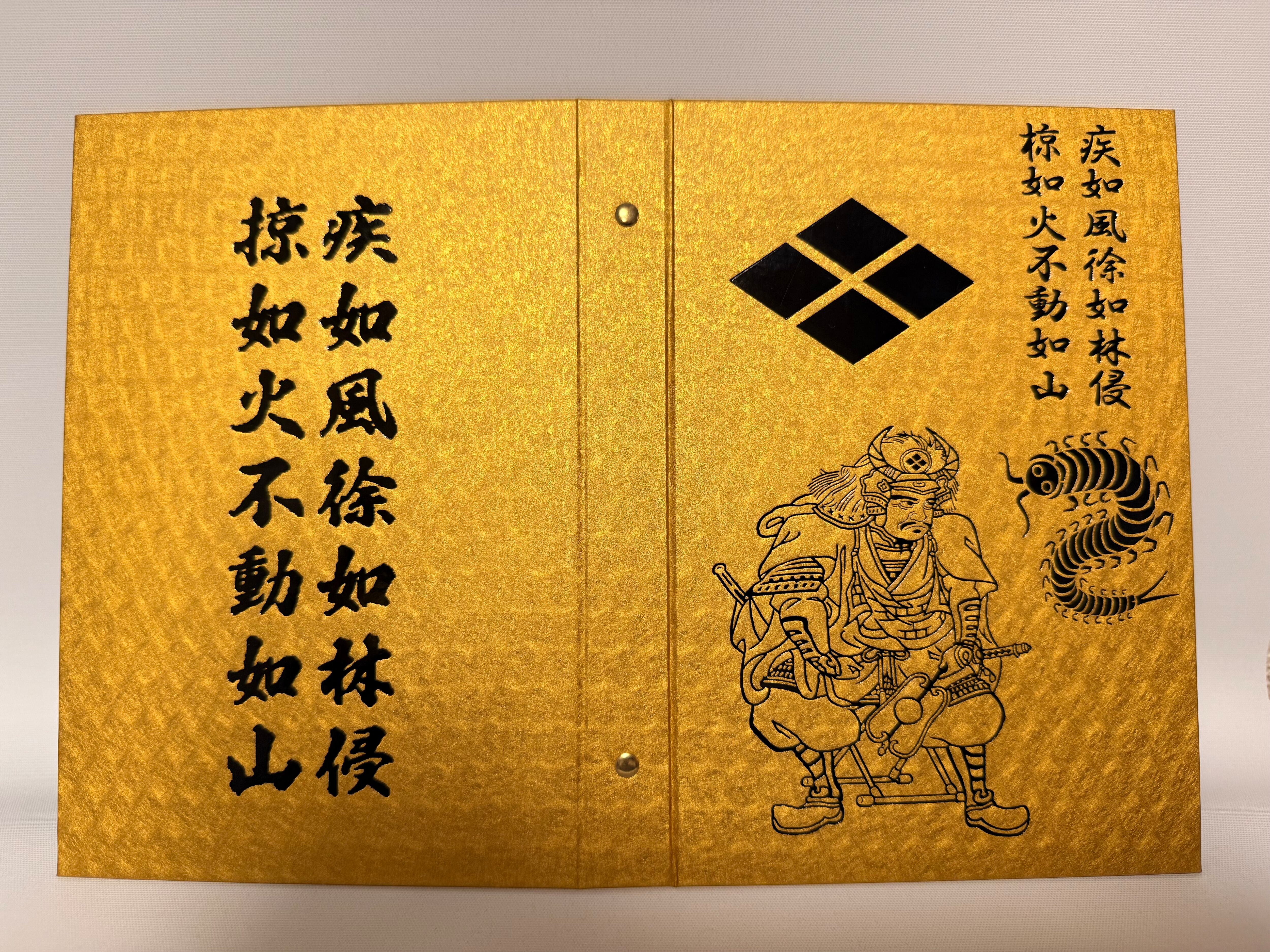 表紙には武田肖像画が美しくデザインされ、豪華な金紙が用いられた仕上がりが魅力的です。裏面にも信玄の戦国時代を感じさせる旗印が施され、所有する喜びを一層引き立てる逸品となっています。日常生活でも自信を持ってお使いいただけるアイテムです。