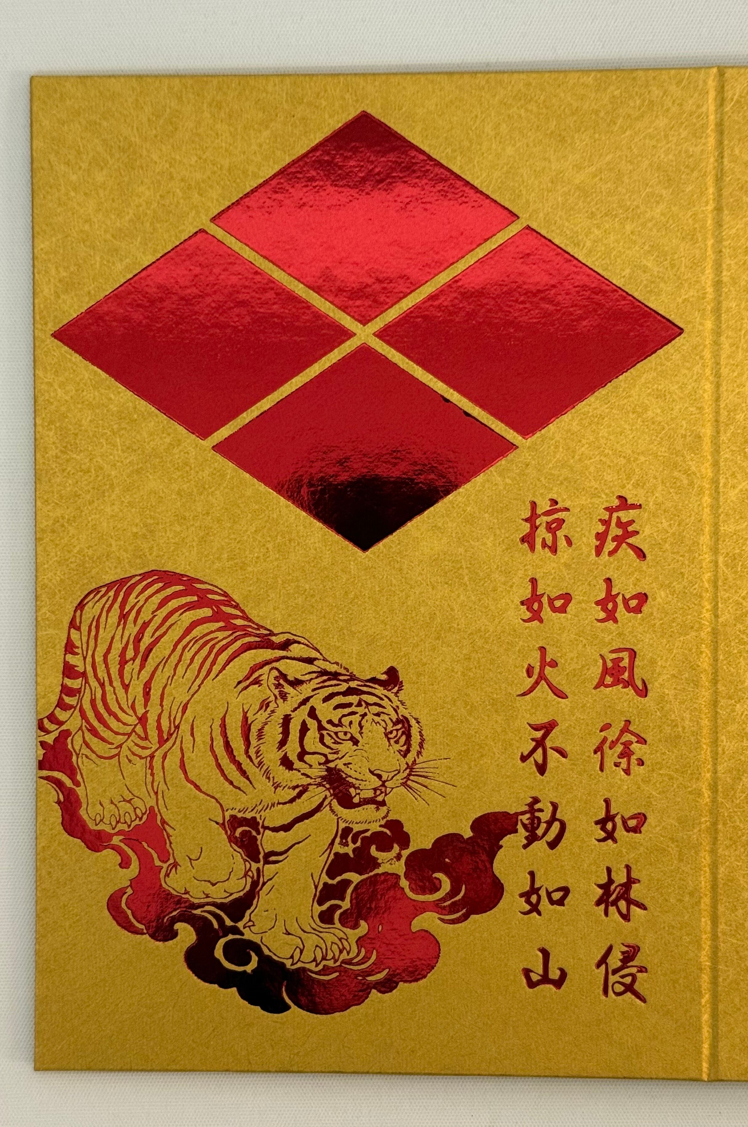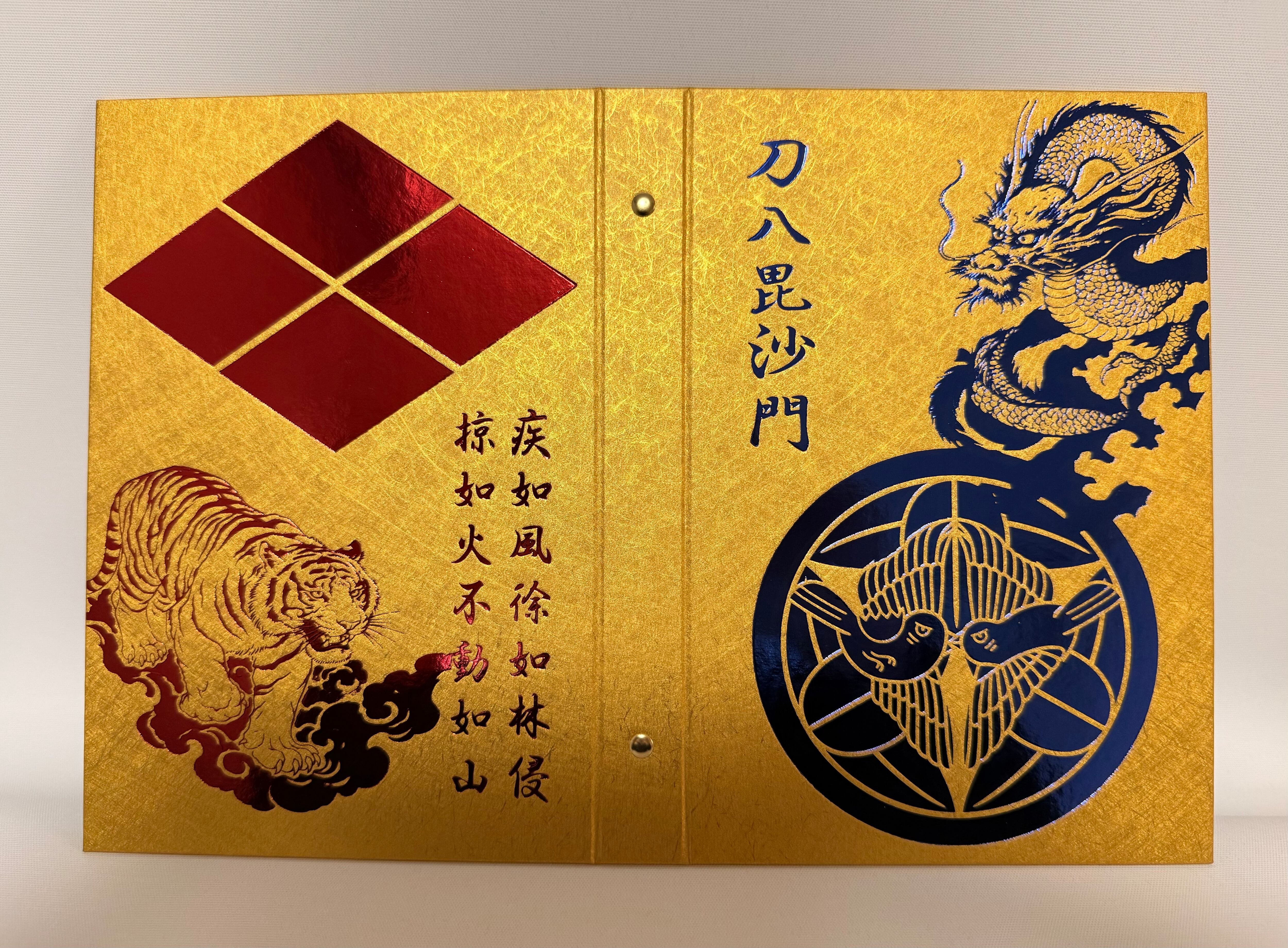 表紙には上杉謙信と武田信玄の家紋と象徴的な龍虎が美しくあしらわれており、気品のあるデザインが魅力的です。表紙は金紙を使用しそれぞれ青と赤の箔で表現しており、所有する喜びを一層引き立てる逸品に仕上がっています。日常生活でも自信を持ってお使いいただけるでしょう。