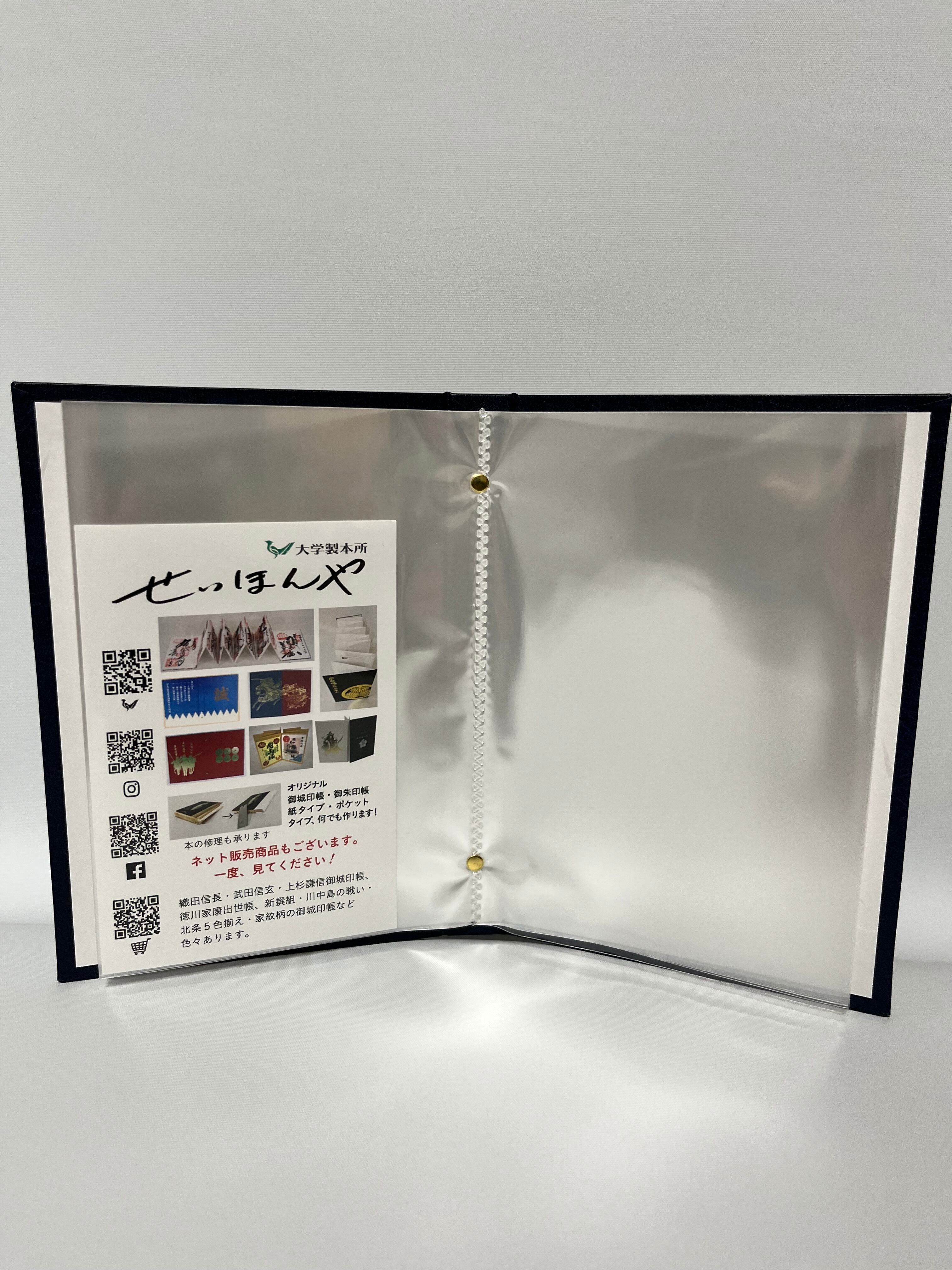 ポケットが20枚搭載されており、表裏で最大40枚の御城印を収納可能です。ポケットサイズはB6サイズまで対応しているため、大きめの御城印も安心して収められます。